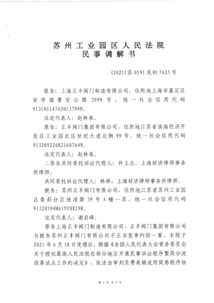 2021年我公司起訴“蘇州正豐閥門有限公司”不正當(dāng)競(jìng)爭(zhēng)一案,此案由蘇州工業(yè)園區(qū)人民法院審理。