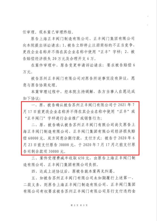 處理結(jié)果如下:被告“蘇州正豐閥門有限公司”于2021年7月17日前更改企業(yè)名稱并不得在其企業(yè)名稱中使用“正豐”或“正豐閥門”字樣進(jìn)行企業(yè)推廣或銷售行為,并賠償原告經(jīng)濟(jì)損失6萬(wàn)元。