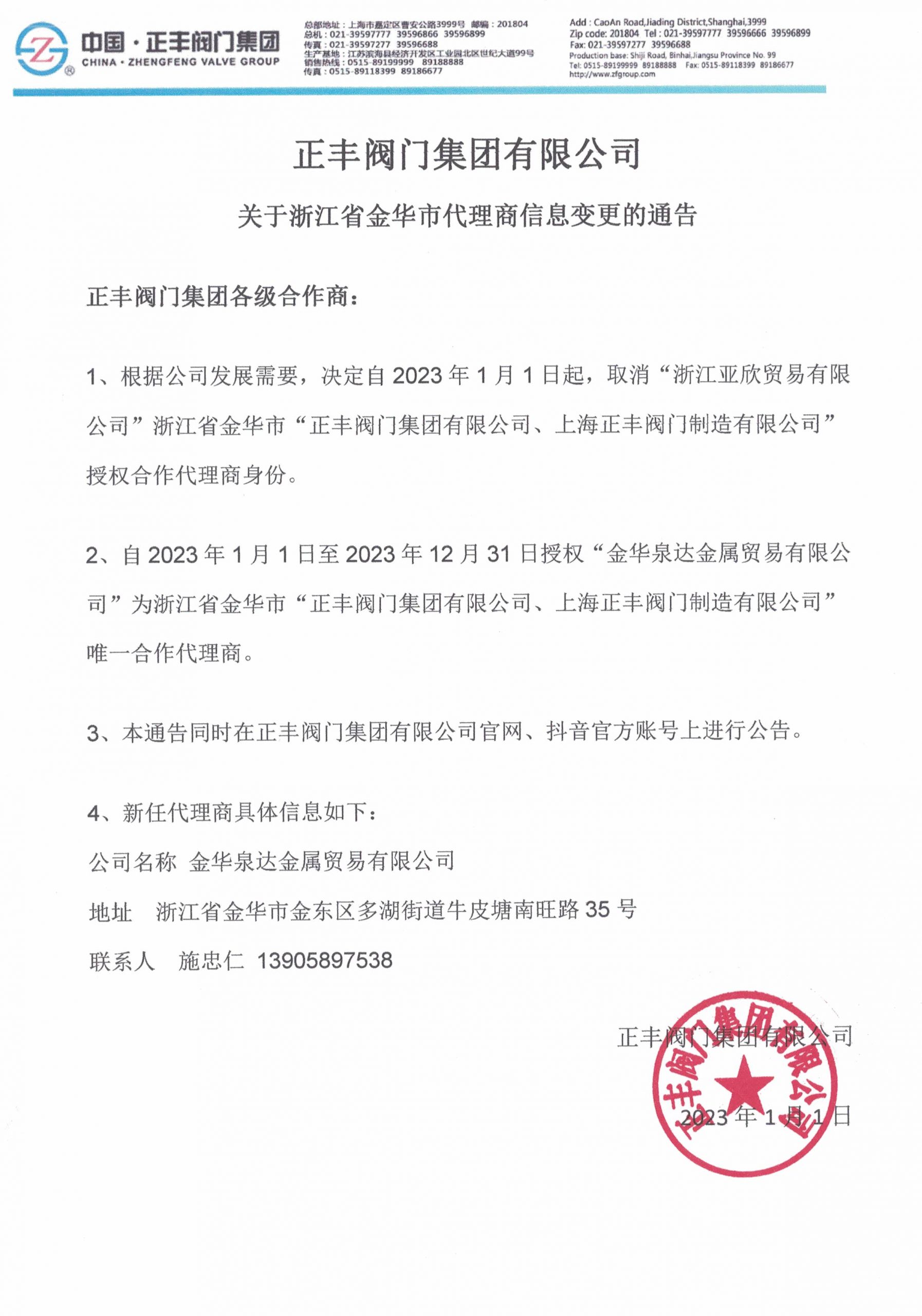 關于浙江省金華市代理商信息變更的通告